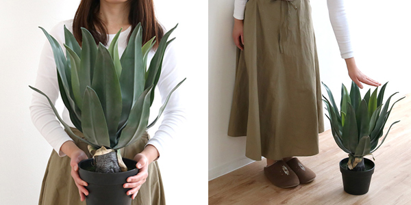 葉の部分は肉厚でマットな質感です。ワイヤーが入っているので、お好みの角度に広げられます。葉を広げることで印象を変えることもできるので、家具やインテリアとのイメージに合わせやすいです。お好みのポットカバーに入れても素敵なインテリアになりそうです。