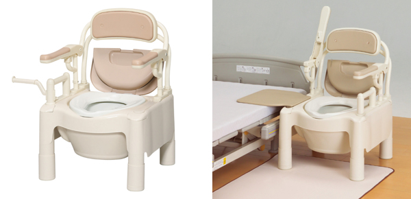 ●樹脂製ポータブルトイレ”ちびくまくん”シリーズのひじ掛けはね上げタイプです。