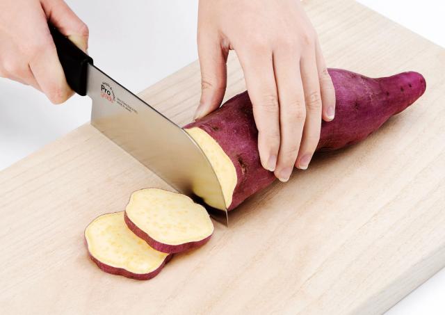一般的な包丁よりも短い構造なので刃先まで力が伝わりやすく、さつまいもやレンコン等の硬い食材に適しています。硬い野菜の調理にお悩みの方でも料理タイムが楽しくなります。