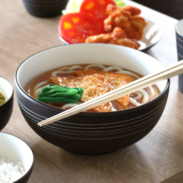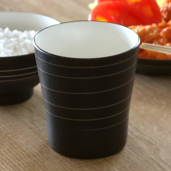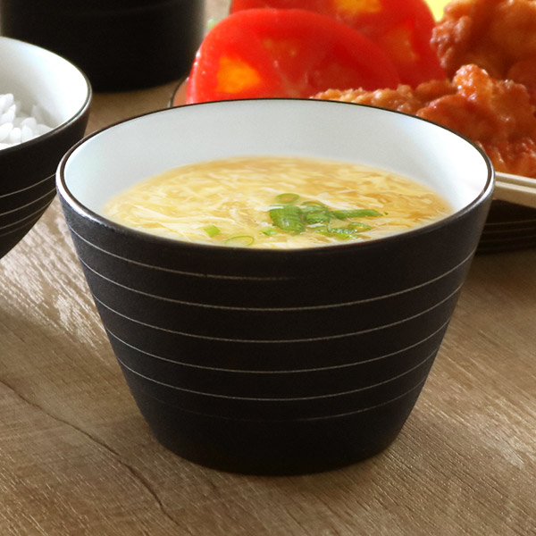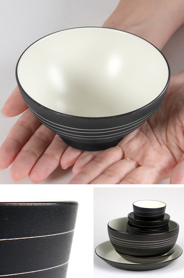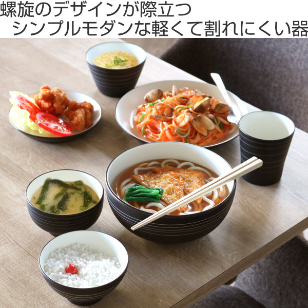 らせん状の白線が目を惹くモノトーンカラーの飯椀です。落としても割れにくく、軽い素材で日常使いに最適です。シンプルでモダンなデザインは、和洋問わず様々なシーンで活躍します。
