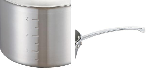 | 調理に便利な目盛り付き 調理時に便利な目盛り付きです。調理容量は8分目程度が目安です。 | 耐熱ハンドル仕様 ステンレスキャストを使用した耐熱ハンドル仕様で取手は熱くなりにくいです。 |