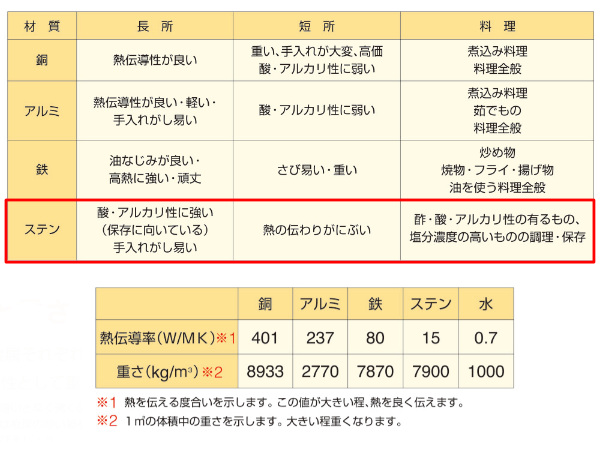 アルミなどと比べて熱の伝わり方はにぶいですが、その分保温性があります。耐食性もありサビに強くお手入れがしやすいです。表面が固いので汚れがつきにくく、汚れても比較的落としやすいのが特徴です。また、酢・酸・アルカリ性のあるものや、塩分濃度の高いものの調理や保存に向いています。
