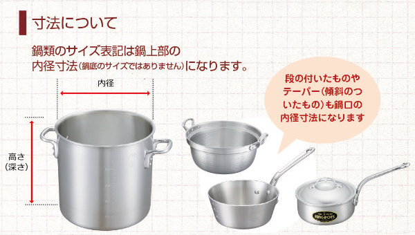 | 注意事項 | ※ご家庭用は15〜24cm位が最適なサイズです。最大でも27cmが目安です。 ※大きいサイズのものはコンロの大きさ、コンロ周りにも気を付けてください。 |