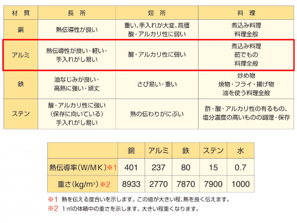 調理器具は同じカタチでもアルミ製やステンレス製など色々な金属が使われており、特徴が異なります。それぞれの金属の特性を理解して、料理に合ったお鍋を選びましょう。