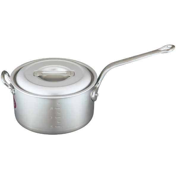 プロユースのハードな使用に適したスタンダードなアルミの向手付き片手鍋です。純度の高いAL1100‐Pアルミ材を使用し、本体は研磨仕上げ、蓋はアルマイト加工が施されています。特殊ドローイングプレス加工により、強靭で耐久性がある頑丈な作りになっています。下ごしらえとして野菜などを茹でたり、スープ作りなど日常的に役立ちます。向手付きなので別のコンロへの移動も両手で安心して行えます。