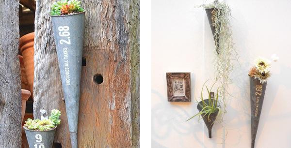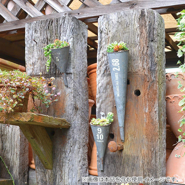 漏斗の形がユニークなブリキ製の壁用プランターです。多肉植物を植えたり、エアプランツを置いて個性的なお庭作りが出来るアイテムです。ドライフラワーを飾り、お部屋の壁をデコレーションしても素敵です。