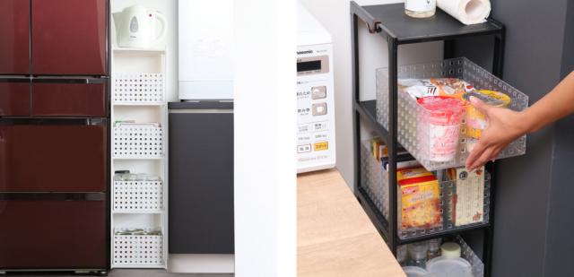 スリムな幅で冷蔵庫横のスペースなどにも入るため、キッチン収納としても大活躍します。別売りのボックスを使うと、食品のストックなどもたっぷり入って便利です。