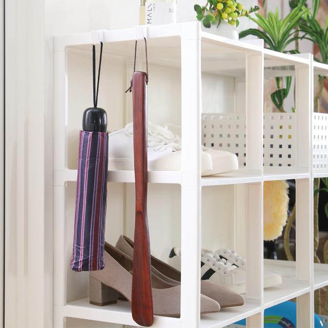 付属品としてフックが8つ付いており、どこの段にもお好きなところへ取り付けが可能です。折り畳み傘や靴べらなどを引っ掛けることが出来て、散らかりがちな玄関の整理整頓に活躍します。