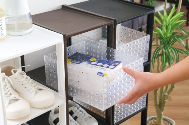 別売りのボックスを使うと靴以外の物もたくさん収納できます。例えば、雨具や日よけグッズ、防寒具、マスク、子どものおもちゃなど、外出時すぐに必要なアイテムを玄関に置いておけます。シューズケア用品や掃除道具などの収納にもおすすめです。