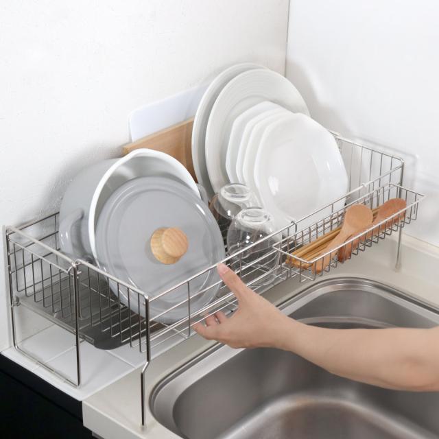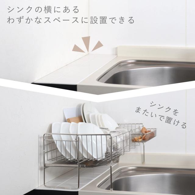 シンクと接するのは脚の部分だけなので、奥行きが合えばシンクをまたいで設置が可能です。場所を取らずに置けるスリムな水切りラックは、食洗機NGの食器やお弁当箱などちょっと洗い用のサブ水切りとしても使えます。