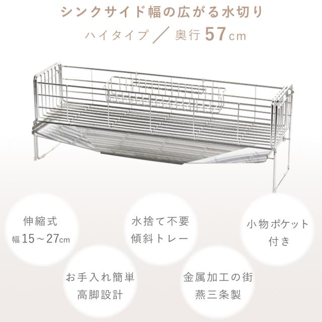 水切りラック シンクサイド幅の広がる水切りハイ 幅15×奥行57cm ( シンク上 伸縮 スリム ステンレス 水切り シンク横 日本製 コンパクト 水切りかご おしゃれ シンク 渡せる シンクサイド 大容量 水切りカゴ 水切りバスケット )