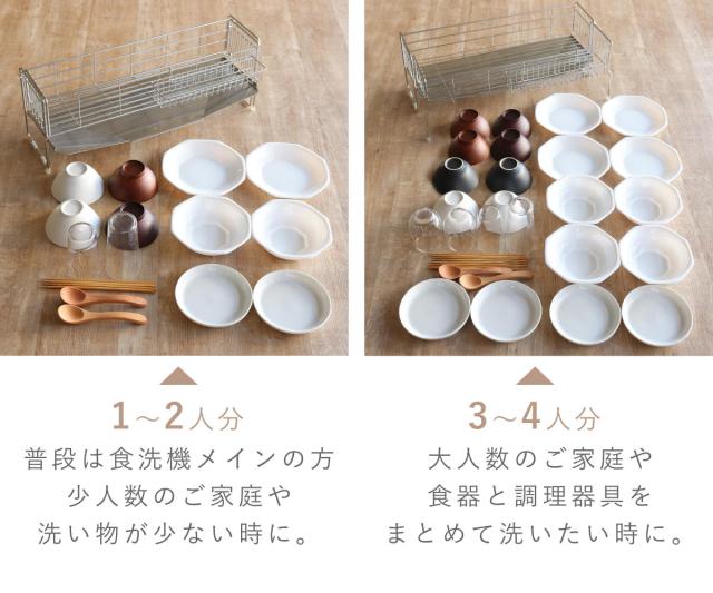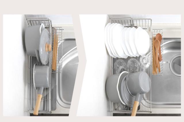 必要に応じて幅を約15cmから27cmまで伸ばすことができます。来客時や家族揃っての食事など、洗い物が多いときはサッとスライドさせて食器をたっぷり収納できます。