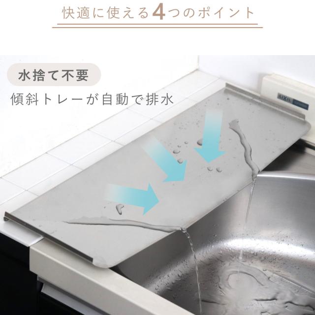 食器から落ちた水は、中央に向かって傾斜のついたトレーから直接シンクに流れ落ちます。両面ともにこまめに中性洗剤で洗い水気を拭き取ると、変色やサビからも守れます。お手入れの際はトレーを前面から外すこともできます。