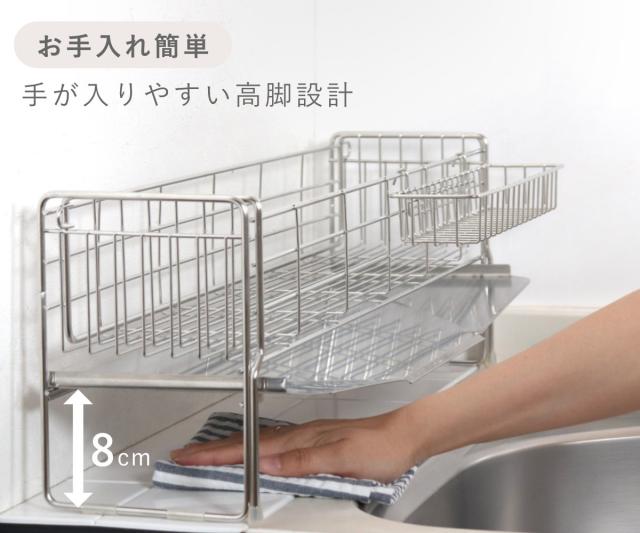脚が高いハイタイプの水切りラックは、水が溜まって不衛生になりがちなトレーの下にも手が入りやすくお掃除も簡単にできます。