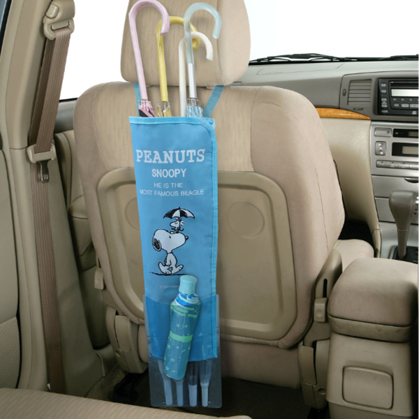 傘をきちんと収納出来るスヌーピーの傘ケースです。長い傘と折りたたみ傘がそれぞれ入るので使いやすいです。車内で使用出来、雨の日は足元が濡れるのを気にする必要がありません。面ファスナー付きベルトでヘッドレスポールへ簡単に取り付け出来ます。