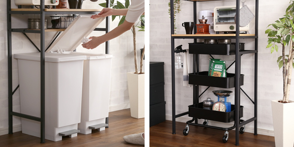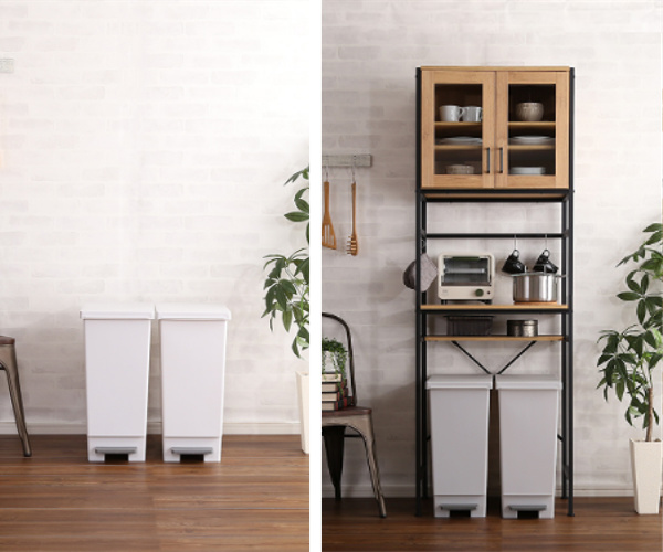 ごみ箱上の空いた空間を有効活用し、食器やキッチン家電を収納することができるラックです。一般的な容量45Lスリムタイプの蓋つきごみ箱が2個並べられます。