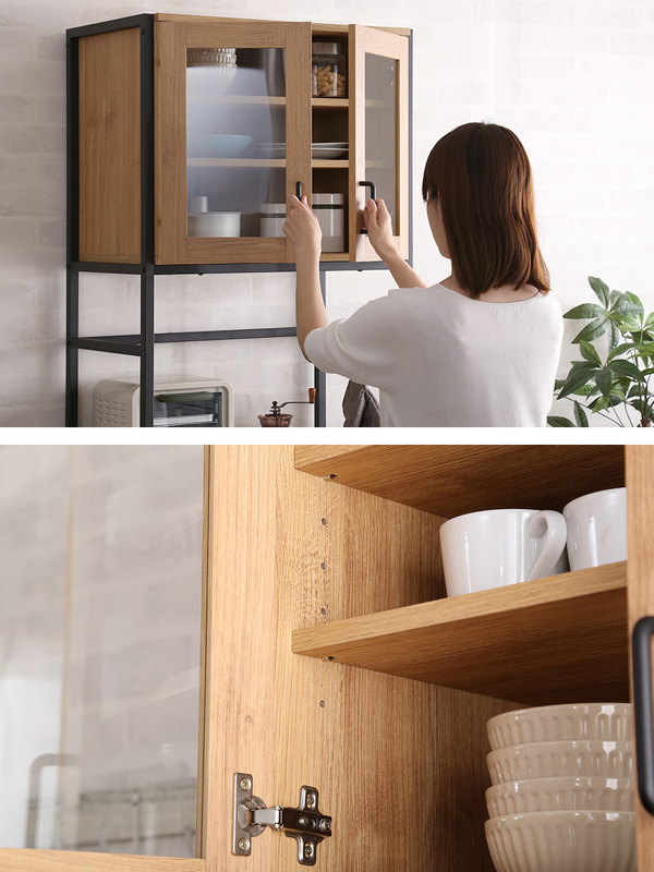 両開きの開き戸なので、大きめの食器も置けて、出し入れがスムーズに行えます。扉には安全性を重視して、割れにくいクリアなガラスを使用しています。扉内の棚は可動棚になっているので、収納するものに合わせて調節していただけます。