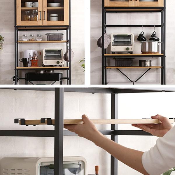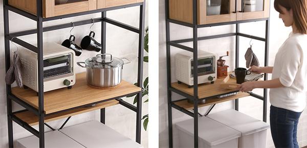 中段のスペースはキッチン家電の設置にぴったりです。フレーム構造で熱や蒸気がこもらないため、炊飯器やオーブンレンジも安心して設置できます。調理の準備などがしやすい高さなので、作業台として使うこともできます。