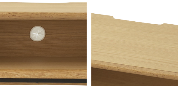 | 配線穴 DVDレコーダーやゲーム機などのAV機器の配線を後ろに通していただけるようになっているので、まとまりにくい配線も片付いた印象になります。 | コードスリット 壁にぴったり付けてもテレビの配線を裏に通すことができます。 |