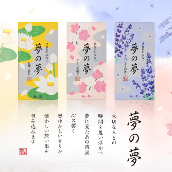 現代のニーズに応え、けむりが少なく、夢に見た一時の情景と大切な人に思いを馳せる心落ち着く香り、をテーマにつくられたお線香が「夢の夢」です。大地から目覚めるように花開き、清く心に吹き抜けるような、爽やかなラベンダーの香りです。