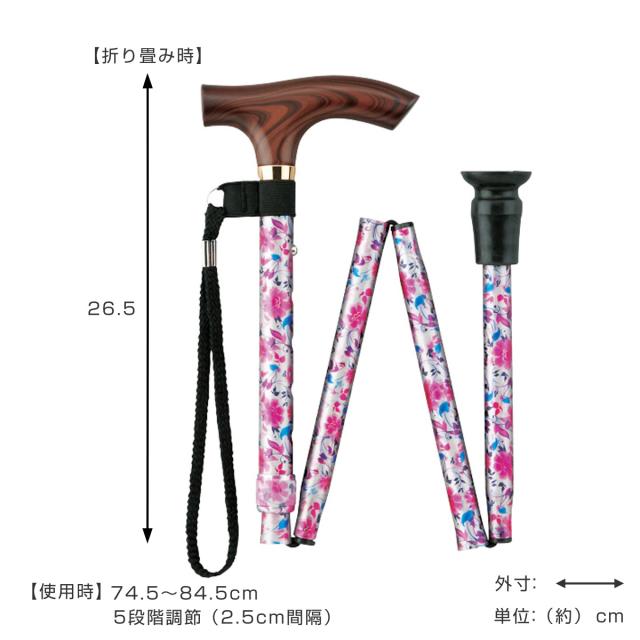 | サイズ | 使用時長さ:約74.5〜84.5cm 伸縮5段階(2.5cm間隔) 折りたたみ時:約26.5cm 杖先ゴム径:16mm |