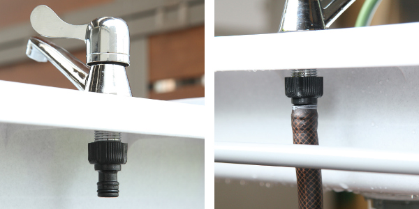 ホースリール等を簡単に接続出来るので、水道から離れた場所でも使用可能で作業範囲が広がります。ホースリールは付属していないのでご自身でご用意下さい。