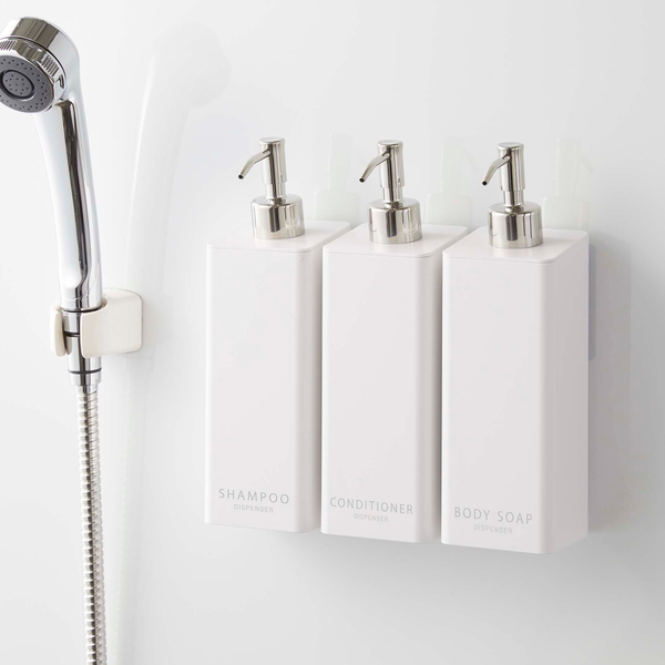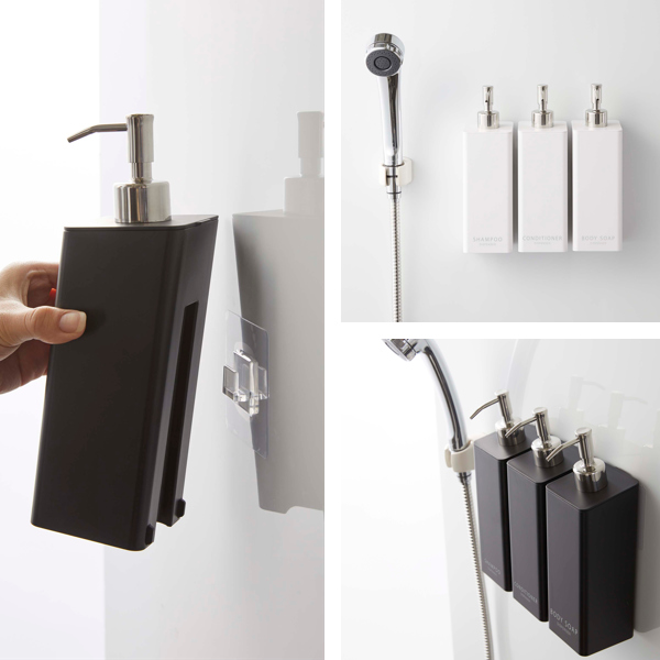 フィルムフックで浴室壁面に浮かせて収納できるディスペンサーです。マグネットが付かない場所でも、フックを貼り付けてディスペンサーを掛けるだけ。耐荷重内であればズレたり取れることもなく、快適にお使いいただけます。