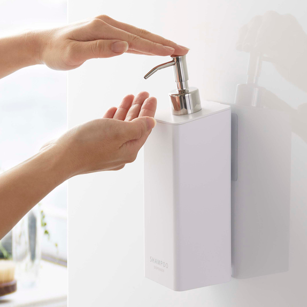 浴室壁面に付けたまま、ポンプを押して液体を出すことができます。上部が斜めになっているので、壁に付いたままでもポンプが押しやすい仕様です。浮かせて設置するので、水はけも良く底がぬめらず衛生的です。