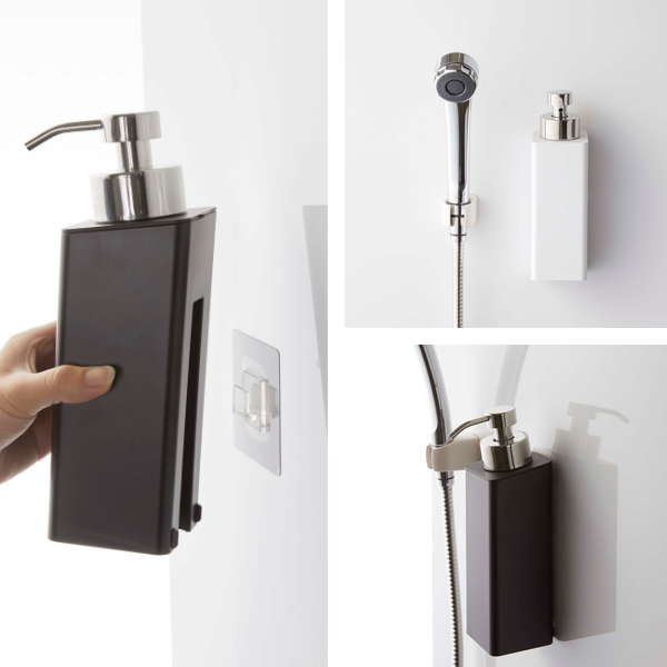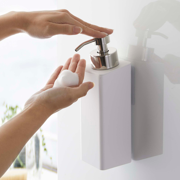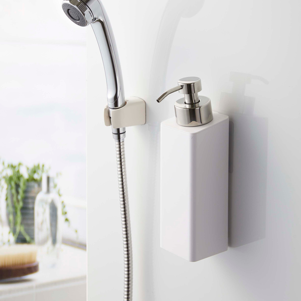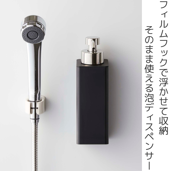 フィルムフックで浴室壁面に浮かせて収納できる、泡タイプ専用ディスペンサーです。泡で出てくるタイプの洗顔ソープやボディーソープにお使いいただけます。マグネットが付かない場所でも、フックを貼り付けてディスペンサーを掛けるだけで快適にお使いいただけます。