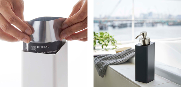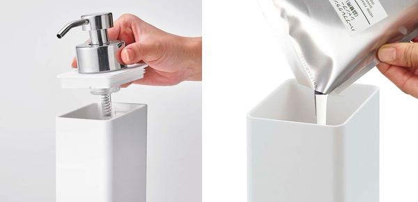 | 詰め替え袋OK 詰め替え用袋をそのまま入れることもできます。 | 置いても使える 壁面に付けずに置いた状態でもお使いいただけます。 |