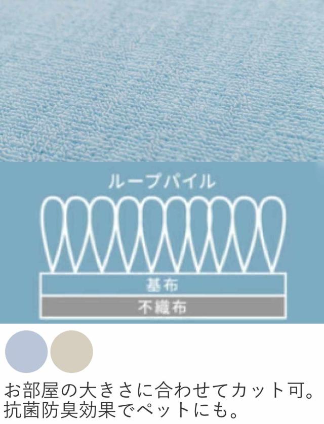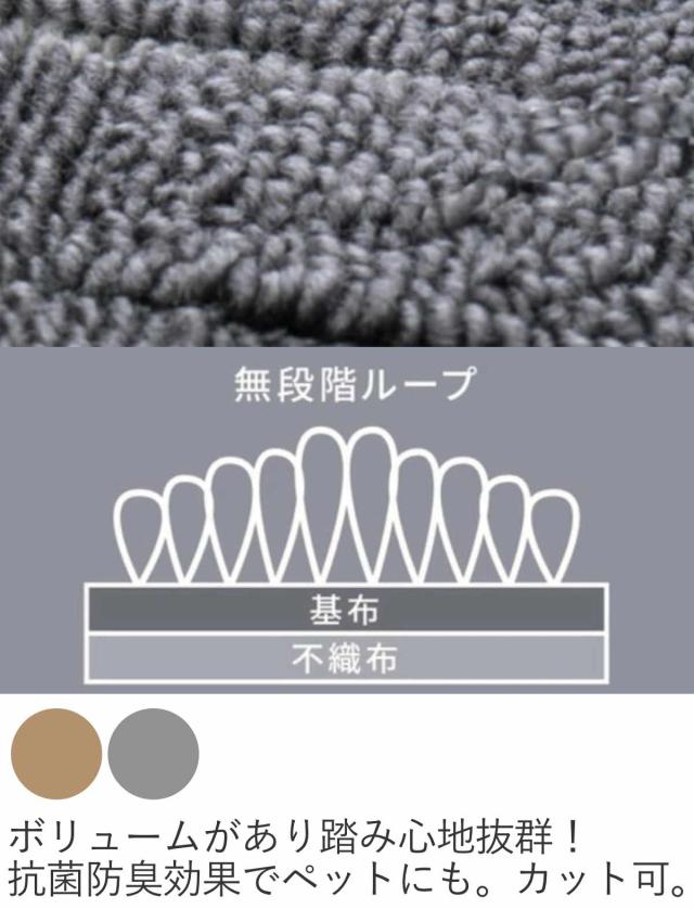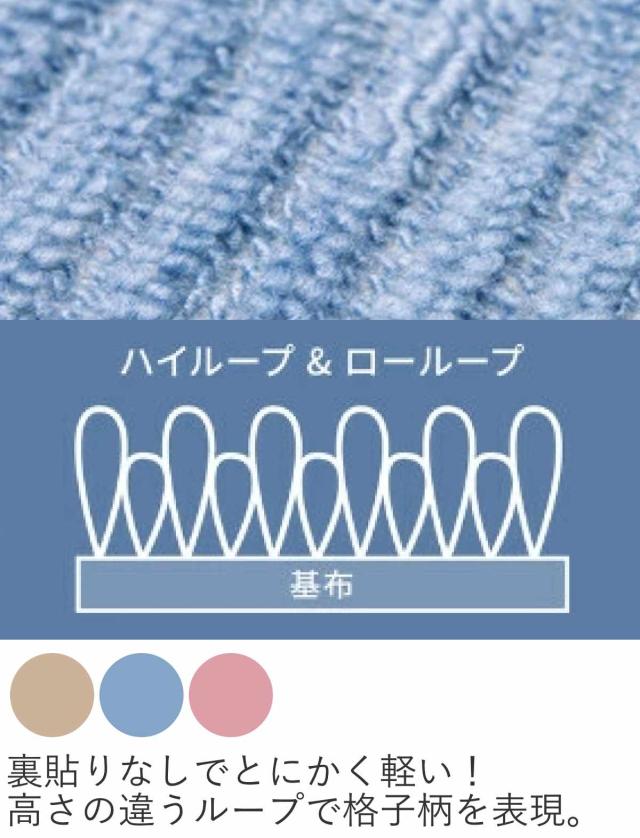タオルのようなループ状パイルのカーペットです。弾力があり復元性に優れているのでへたりにくく、長くお使いいただけます。またループに高低差を付けて凹凸を出しているので、立体感のあるデザインになっています。