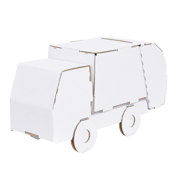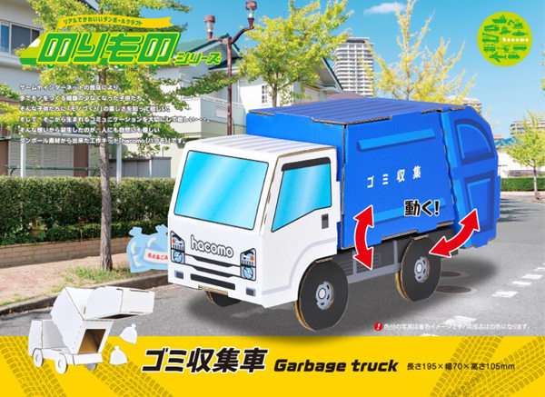 ●人にも自然にも優しいダンボール素材の工作キット「hacomo」のりものシリーズのゴミ収集車です。