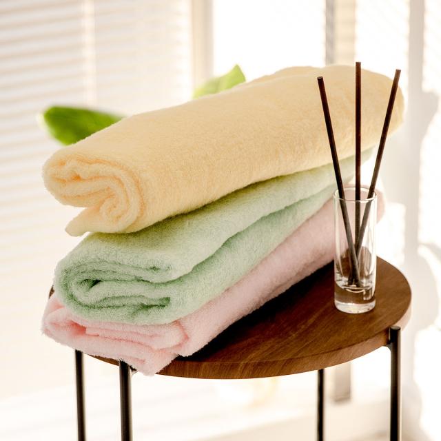 高級極細綿糸を特殊加工し(エアーフィーリング糸)、たっぷり空気をふくんで、雲のように柔らかく仕上げています。卵を上から落としても割れない柔らかさで、赤ちゃんが初めて触れるタオルとして、また敏感肌の人にもピッタリです。