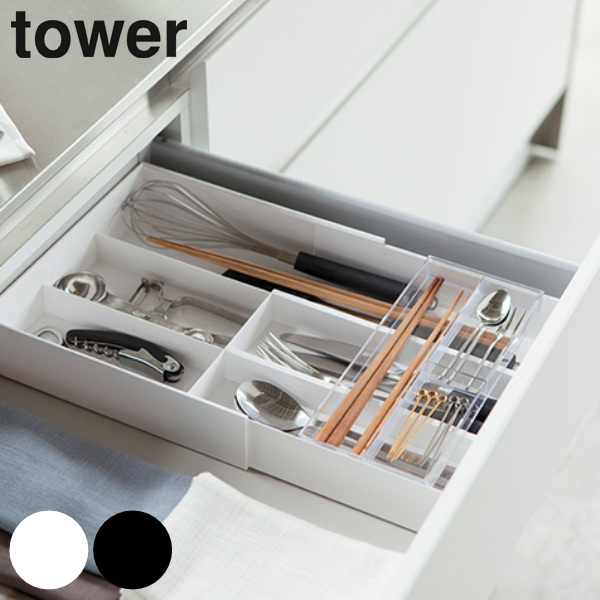 tower 山崎実業 立体横伸縮 カトラリーケース ( タワー 山崎実業 カトラリートレー カトラリー トレー ケース 収納 伸縮 カトラリー収納 斜め サイズ調整 キッチン収納トレー 整理ケース 小物収納 キッチン収納 引き出し収納 tower 山崎実業 キッチン タワー)