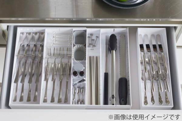 付属の仕切り板は透明なので、カトラリーが重なり合っている部分も収納物が見えるようになっています。どこに何があるかわかりやすく、誰でも使いやすい仕様です。