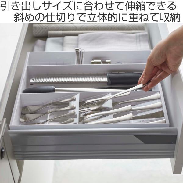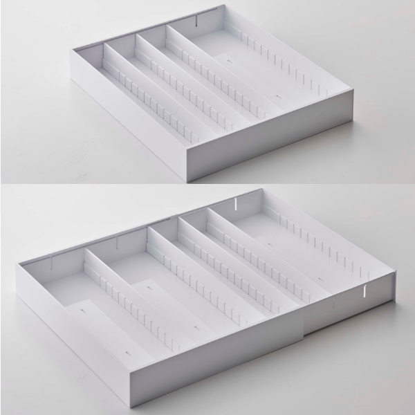 引き出しの中に入れてカトラリーを分類収納できる伸縮式の仕切り付きカトラリートレーです。スリム形状で複数で組み合わせても使いやすく、散らかりがちなカトラリーやキッチン小物がスッキリ整理整頓できます。