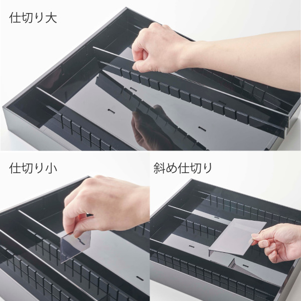 横幅だけでなく入れる物に合わせて仕切れる3種類の仕切りが付いています。