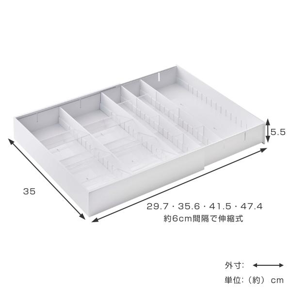 引き出しサイズに合わせて横幅が約6cmごとに調節できる伸縮構造で、ぴったり合わせられます。これまで横に余っていたスペースをフル活用して収納力をアップすることができ、デッドスペースが生まれないので気持ちよく収納スペースを整えることができます。