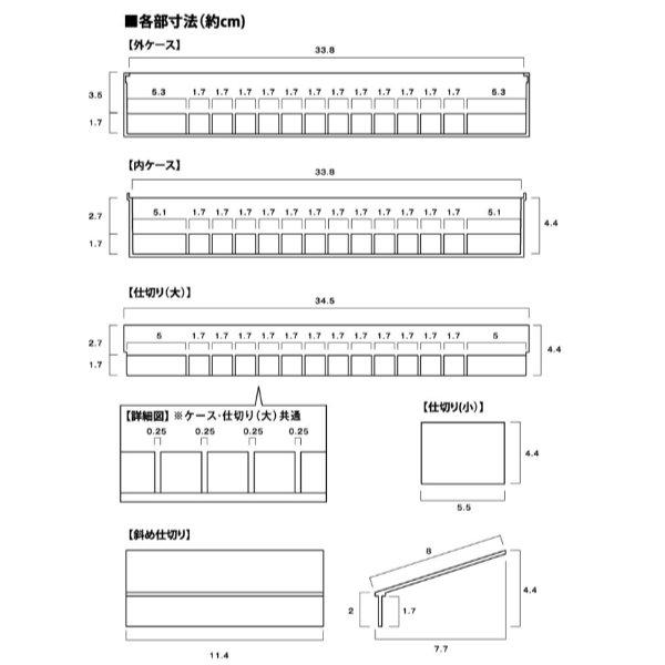 | 材質 | ケース・仕切り(大):ABS樹脂 斜め仕切り・仕切り(小):PS樹脂 滑り止め:シリコーン |