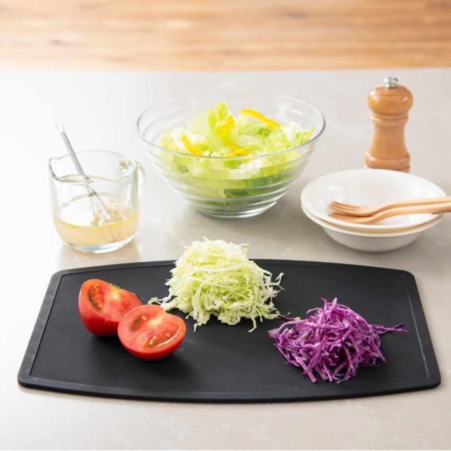 ゴムのような柔らかさとプラスチックのような軽さがあるTPU製のまな板です。一般的なまな板はついたキズから菌が繁殖しやすいですが、TPU素材のまな板は弾力があり元に戻ろうとする復元力が働くのでキズがつきにくく、菌が繁殖しにくい特徴があります。また、弾力性があるので刃あたりが優しく刃こぼれしにくいです。