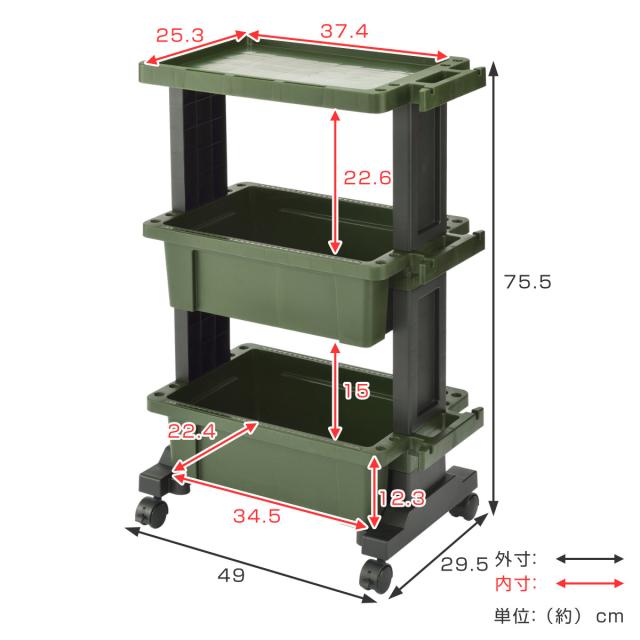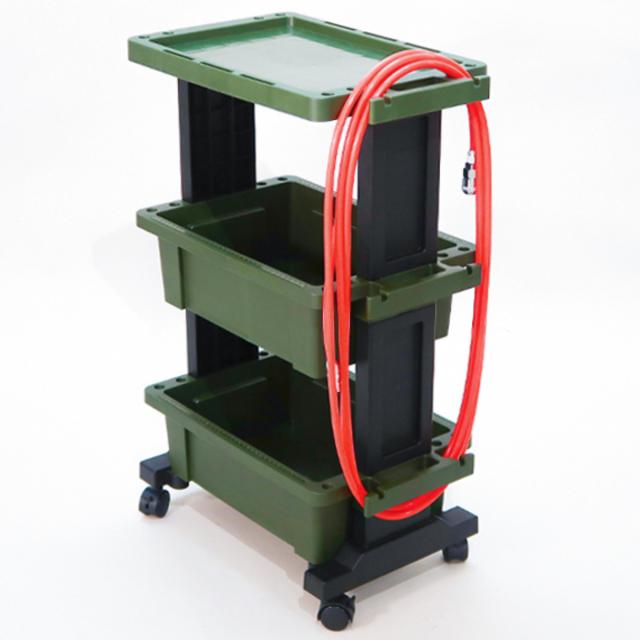 《 LH8358 幅49×奥行29.5×高さ75.5cm 約 幅 50 奥行 30 高さ 75 センチ cm プラスチック 軽い 軽量 ハンガー形状 目盛り付き ホース コード 引っ掛け 作業台 テーブル付き キャスター ツールカート 工具ラック 国産 工具台車 工具収納 移動 小物入れ 道具入れ アウトドア キャンプ 大容量 カーキ グリーン 緑 》