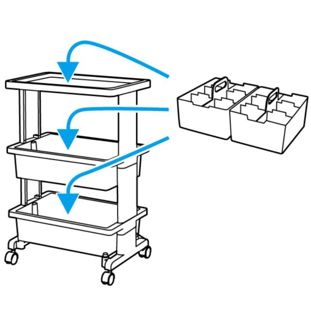 ツールワゴンのワゴン1段に別売りのデスクトートが2個ぴったり収まります。一緒に組み合わせれば細かく種類別に分けて収納ができるため、見つけやすく取り出しやすくなり、より便利にお使いいただけます。
