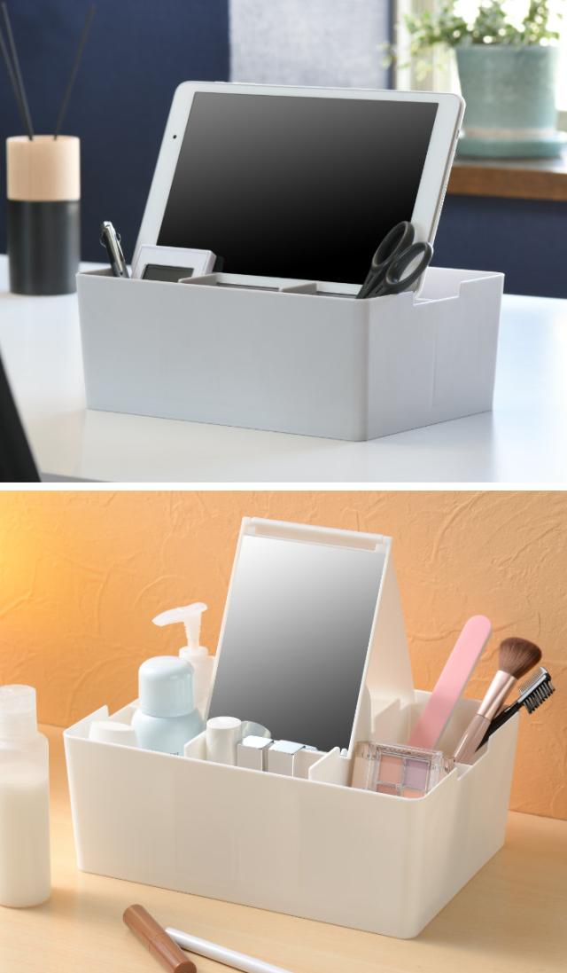 文房具や雑貨、薬、コスメなど様々な小物まとめて収納できる便利なデスクオーガナイザーです。小物収納としてはもちろん、収納しながら仕切り板の凹凸にスマホやタブレットなどを立て掛けられます。在宅ワーク時や動画鑑賞、コスメ収納時には鏡も立て掛けられるので便利にお使いいただけます。