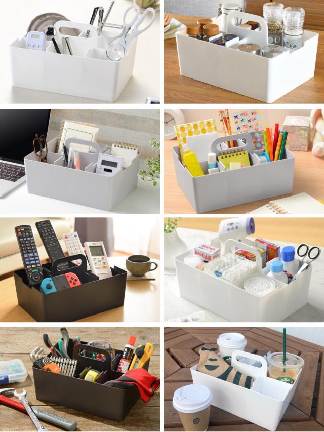 デスクワーク時やお子様の学習机周りで文房具の収納を、リビングではリモコンラックとして、キッチンではキッチン用品や調味料入れとして、その他にも常備薬やコスメなど様々な小物の整理整頓に役立ちます。またレジャーやアウトドア、テイクアウト時に飲み物や食べ物を入れると、倒れずまとめて持ち運べるので便利です。