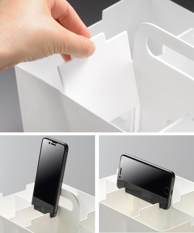 仕切り板は左右凹凸の幅が違うので、仕切り板の向きによって立て掛ける物の角度を変えられます。また、仕切りの幅を調整すれば、タブレットやスマホの向きは縦横どちらの向きにも置くことが可能です。