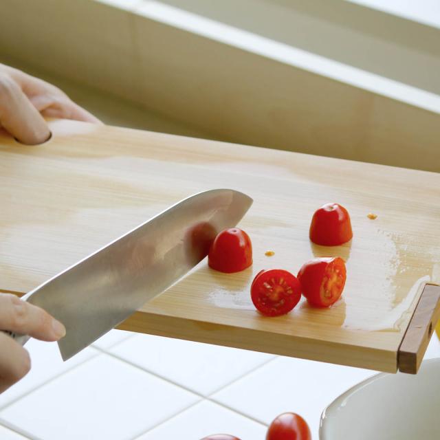 高知県四万十川流域で取れる四万十ひのきは、油分が多く、素早く乾くので、黒ずみしにくい素材です。また天然の抗菌力でバクテリアの繁殖を抑え、まな板に肉や魚の匂いがつくのを防ぐ効果があります。適度な柔らかさで食材がしっかり切れるのはもちろんのこと、切る時の腕の負担も軽減し、包丁の刃にも優しいので、切れ味も長持ちします。