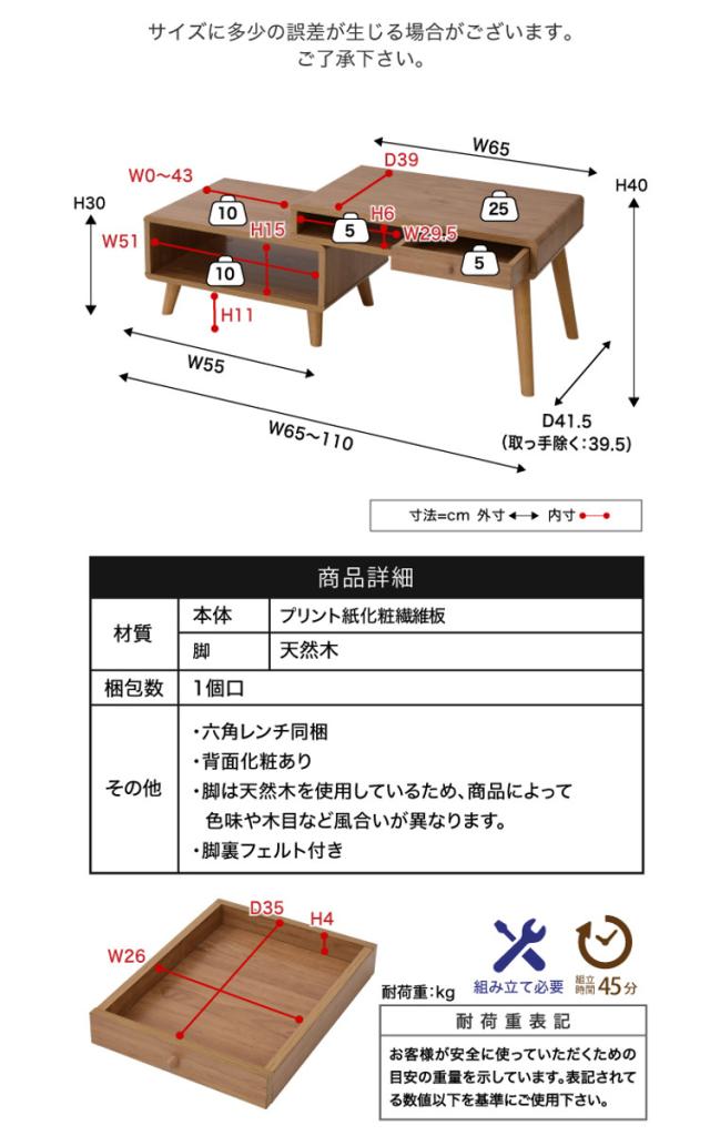| サイズ | 約 幅110×奥行41.5×高さ40(cm) 【伸縮式】最小時:約 幅65、最大時:約 幅110(cm) |
