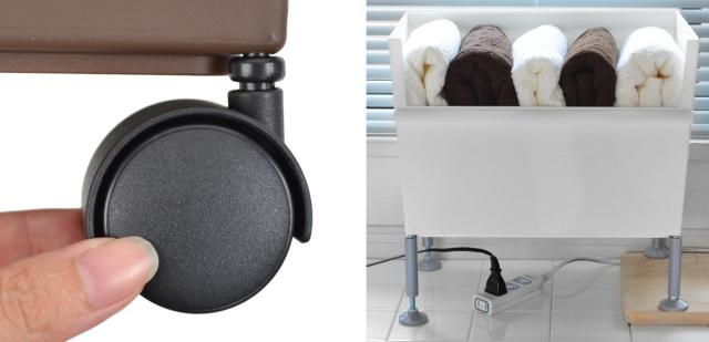 | 移動もラクラク キャスター(別売り)は差し込むだけの簡単取り付けです。キャスター取り付け時は、高さが約5cmアップします。 | 複雑な段差もクリア アジャスター(別売り)を取り付けることで、下にコードや排水栓をまたいだり、段差のある場所にも置いていただくことができます。脚は1本ずつ高さ10cm〜12.5cmでの調節が可能です。 |