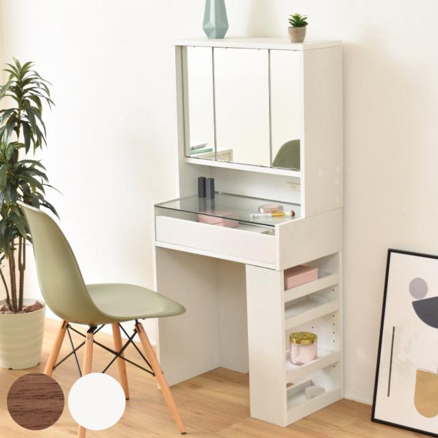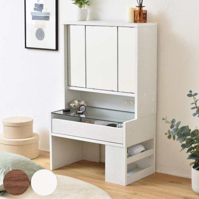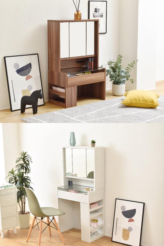 デスクに置くだけでドレッサーとして使える卓上三面鏡です。落ち着いた雰囲気で大人っぽさを演出してくれるダークブラウン、さりげない木目が美しい爽やかなホワイトの2色展開です。簡単な設置で手軽にお使いいただけるので、ドレッサーが欲しいけど、置くスペースが無いという方におすすめです。