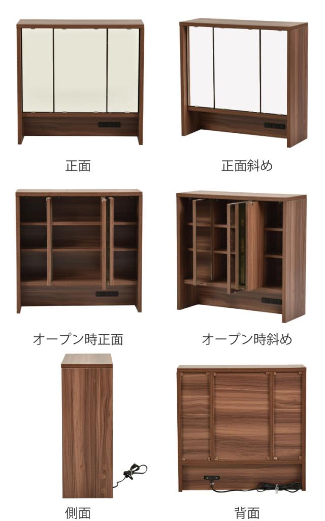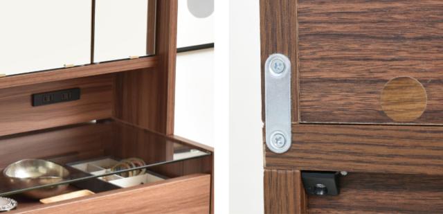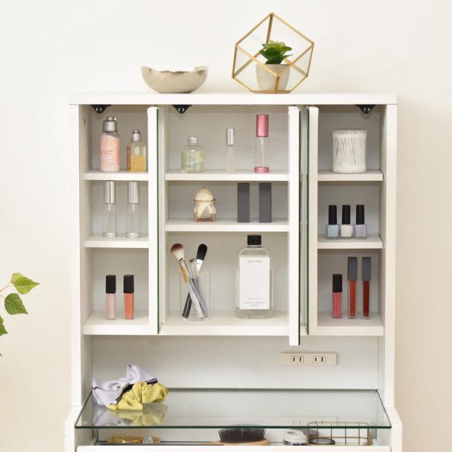 内部は、各ミラーの裏面が収納スペースとして使えるようになっていて、化粧品やスキンケア用品などを入れておけます。ミラーが扉の役割も果たしているので、ホコリも防いでくれます。